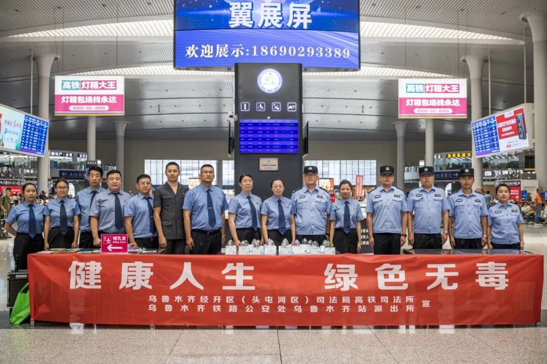 在第37个“6.26”国际禁毒日来临之际,为进一步提升全民识毒、防毒能力,预防和减少毒品犯罪活动,加强铁路辖区毒品预防宣传教育工作,营造全社会参与禁毒斗争的浓厚氛围,乌鲁木齐铁路运输检察分院联合乌鲁木齐铁路运输检察院、乌鲁木齐铁路公安处、乌鲁木齐铁路运输法院、乌鲁木齐经济技术开发区(头屯河区)司法局在乌鲁木齐火车站候车大厅开展禁毒法治宣传活动。